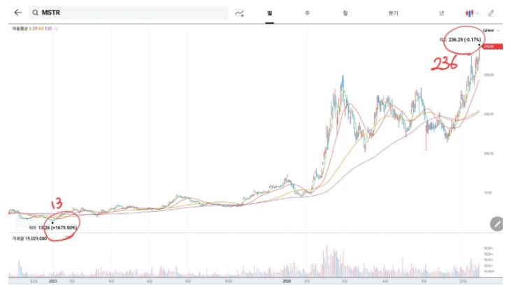 비트코인을 가장 많이 보유하고 있는 기업인 마이크로스트레티지의 주가가 230 달러를 돌파하며 25년 만에 최고가를